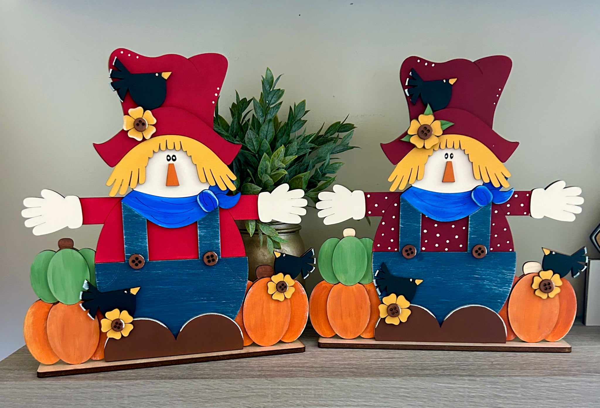 Hand painted, laser cut and layered. This scarecrow has so much depth and is the cutest shelf sitter for Fall.